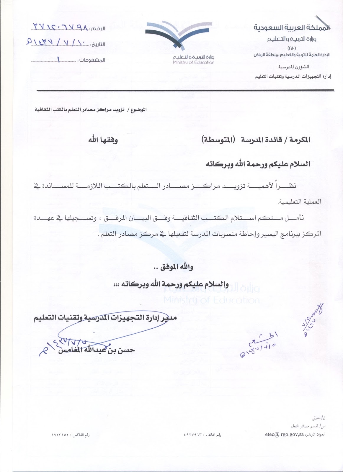 ملتقى أمينات مصادر التعلم بالرياض خطاب صرف الكتب لمدارس مراكز مصادر التعلم